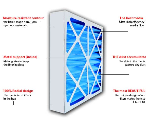Ce filtre est fait à 100% de papier recyclé, il a été spécialement conçu pour rencontrer la norme des bâtiments verts (LEED). Le média du filtre à air est collé sur une grille métallique du côté de l’air sortant, ce qui empêche le flottement tout en gardant l’uniformité du filtre et des plis. Le filtre est introduit dans une boite en carton qui est à l’épreuve de toute forme d’humidité et c’est ce qui rend leur conception si unique. Les supports du filtre sont intégrés sur l’armature du filtre, le média est ensuite collé sur chaque partie de l’armature, empêchant ainsi n’importe quelle possibilité de fuite d’air. Les filtres à air de capacité MERV 13 sont fabriqués avec des matériaux 100% recyclés et ils sont conformes à la norme ASHRAE 52.2.